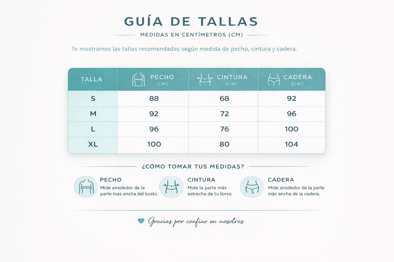 Te mostramos las tallas recomendadas según medida de pecho, cintura y cadera.